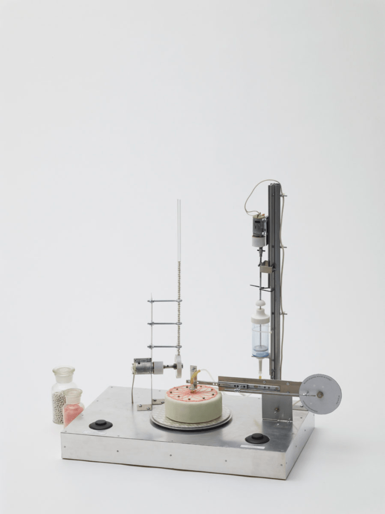 ‘till you stop’ cake decoration machine by mischer traxler studio: A machine decorates a cake with lines, similar to a Spirograph, until the customer/visitor decides to stop the decoration process. Then in a second process sugar pearls are dropped onto the glazing. The decor is continuously changing and the costumer/visitor has to decide whether they prefer a simple design or a more complex one. Once the decoration machine is stopped it can not be started again.