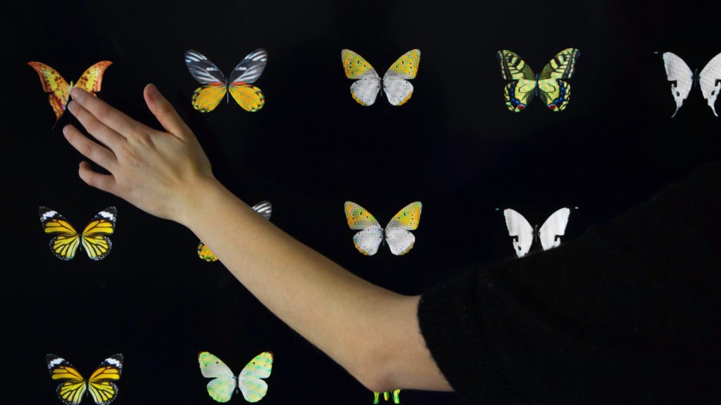In Flutter Wall the viewer is presented with colourful butterflies and have the opportunity to touch the creatures without causing harm. The contact brings the insects to life. The work can quickly transform into a swarming kaleidoscope of butterflies, their frenzied flight dominating the screen before once again they settle to create a stunning array of colour.