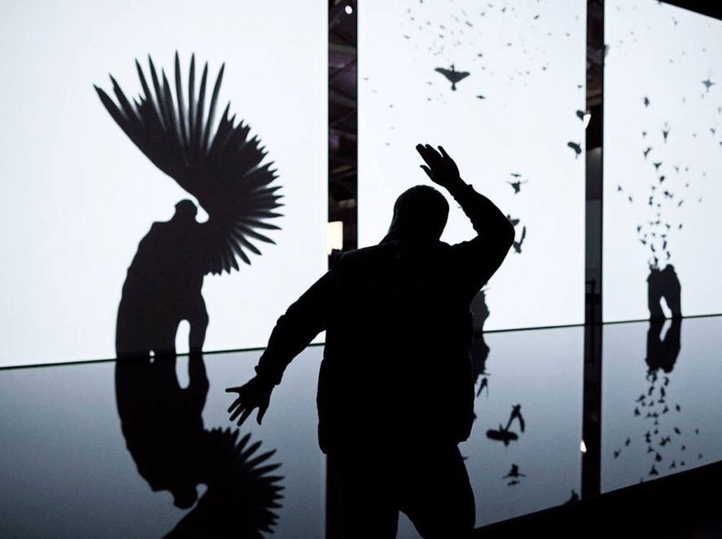 This is a large-scale interactive piece which tells the story of birth, death, and transfiguration that uses projections of the participants’ own bodies to unlock a new artistic language. The work consists of three 30-foot high white panel frames suspended from the ceiling on which digitally captured shadows are reprojected. 3D models of birds interact with the shadows captured by three hidden Kinects.