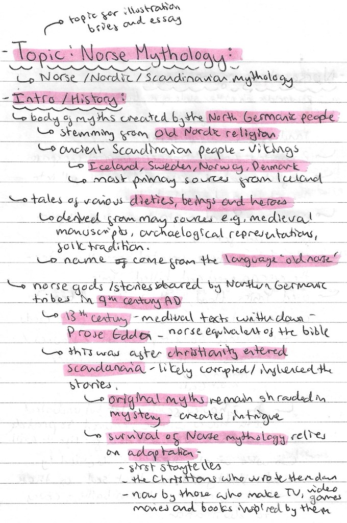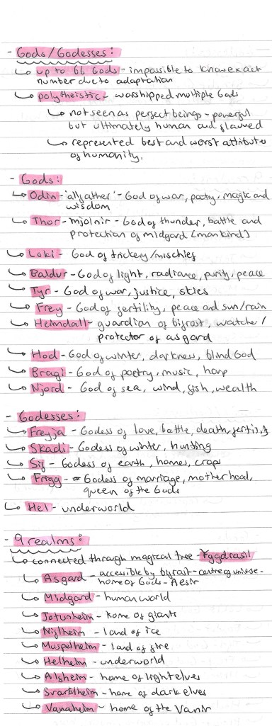 In order to get a good foundational knowledge of the topic I did lots of research into the history, the different gods/goddesses, the 9 realms, the creatures and the creation story. Notes on this research is below: