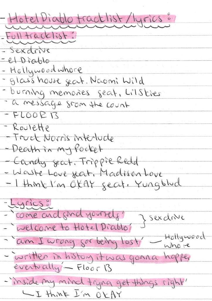 Hotel Diablo track list and lyrics: I noted down all the songs from Hotel Diablo as I’d like to incorporate the track list into my projected work. Also it could be nice to use specific song names in the advertising as a way to link the whole concept together. I also made a note of some specific lyrics from the album that I could use. I think this would be a good way of subtlety referencing the album in a way that fans will understand but the average viewer won’t.