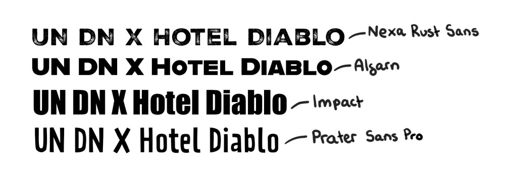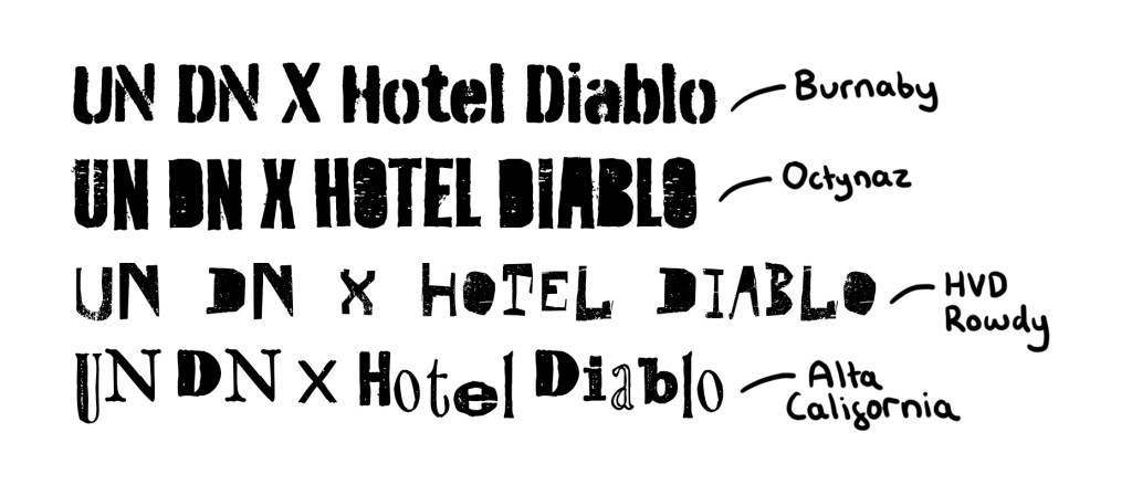 Logos: I won’t be redesigning either logo so will use the existing ones. The 2 logos are very contrasting aesthetics so it will be a challenge to visually balance them in my work. UN DN have simple bold typeface whereas Hotel Diablo have a much more rough hand made quality to it. Finding a middle ground between the 2 could be nice for the display typeface.