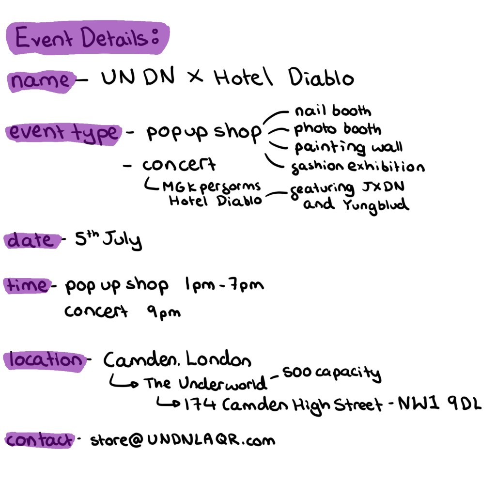 Event Details: These are the finalised details for my event combining UN DN LAQR and Hotel Diablo. I have chosen the event to be a pop up shop with a concert after. UN DN have done pop up event before so I have a basis to work from. At this event I’ll have a range of activities including a nail salon, photo booth, painting wall and fashion exhibition. After the pop up shop there will be a concert where MGK performs Hotel Diablo with some guests who link to the album and brand. I’ve chosen Camden, London as the location and will have it on the 5th July as it’ll be the 5 year anniversary of the album.